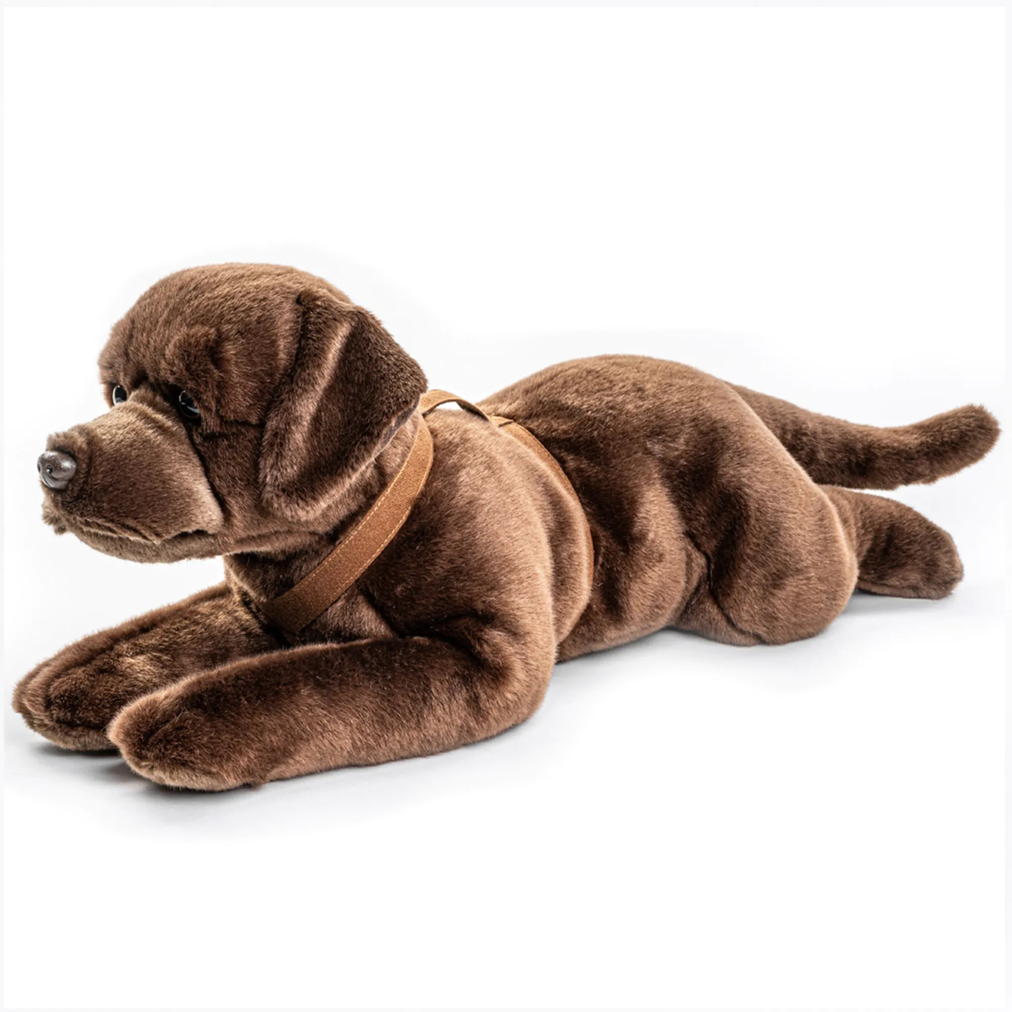 Labrador Plüsch, liegend braun mit Brustgeschirr